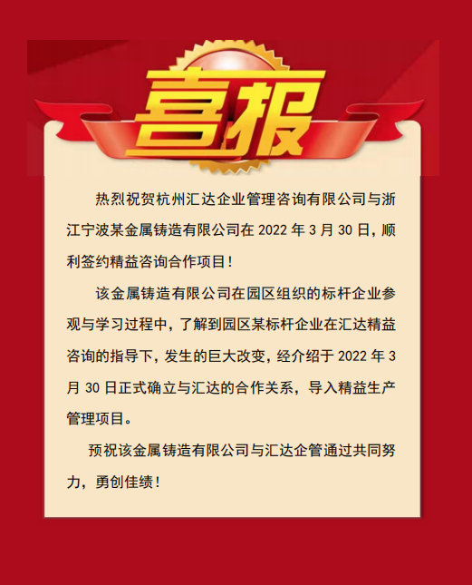 【喜報(bào)】匯達(dá)企管簽約浙江某金屬鑄造有限公司