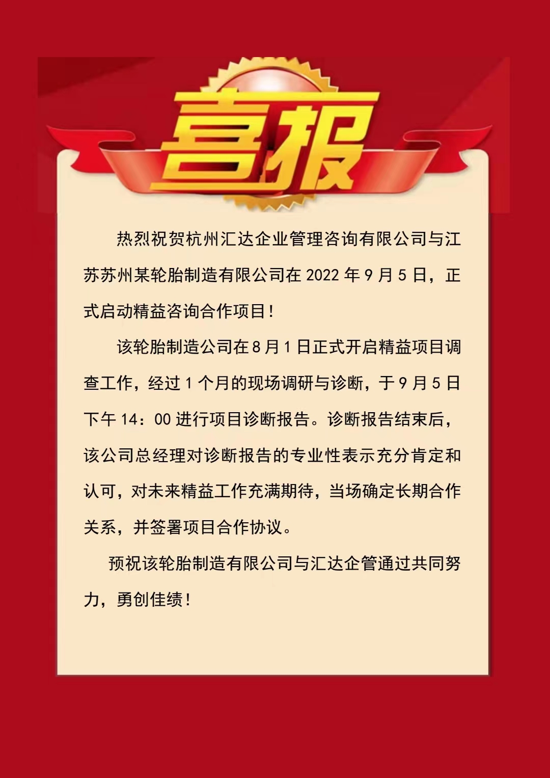【喜報】匯達企管簽約江蘇某輪胎制造公司